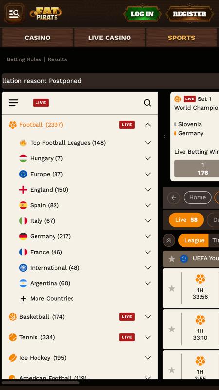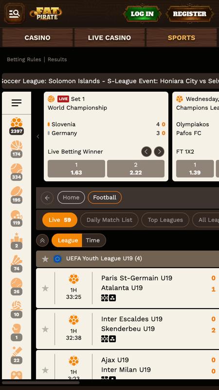A FatPirate nem spórol az opciókkal. Az oldal sportkínálata olyan széles, hogy bőven túllép a megszokott focin–kosárlabdán. Itt megtalálod a klasszikusokat (labdarúgás, tenisz, jégkorong), de felbukkannak olyan egzotikumok is, mint a kabaddi, a krikett, vagy akár a V-Soccer.