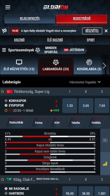 A Glorion élő fogadási felülete nem csupán technikailag működik jól, hangulatot teremt. Itt minden másodpercnek súlya van, minden gomb mögött ott lüktet az esemény. A lefedett élő események száma magas, és nem csak a nagy bajnokságokra koncentrál: a kisebb ligák, ritkábban közvetített mérkőzések is ugyanúgy szerepelnek a kínálatban. Alapvetően minden sportág elérhető élőben is, amit a meccs előtti fogadásra is kínálnak.