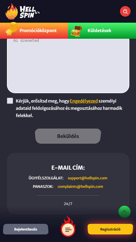 A leggyorsabb opció az élő chat, amely a nap 24 órájában elérhető, és általában pár percen belül válasz érkezik. Emellett e-mailen keresztül is fel lehet venni a kapcsolatot a support csapattal a support@hellspin.com címen, míg hivatalos panasz esetén a complaints@hellspin.com használható. A weboldalon egy kapcsolatfelvételi űrlap is elérhető, ami strukturáltabb megkeresésekhez hasznos.