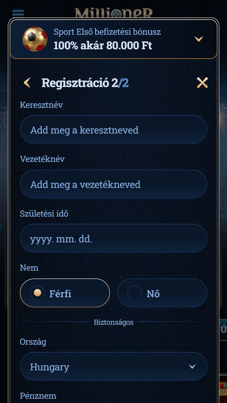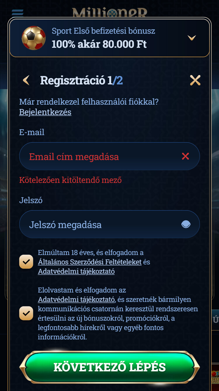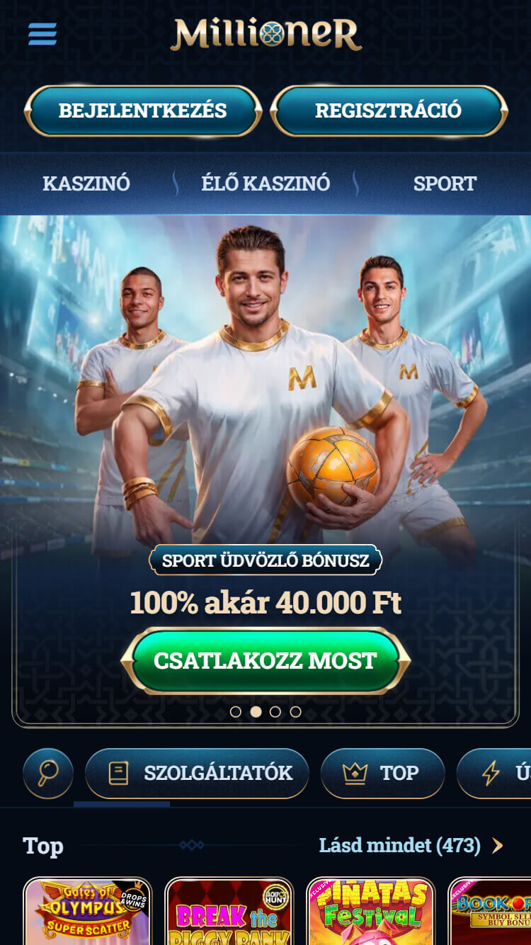 A Millioner oldal első találkozásra megbízhatónak hat: gyorsan tölt be, rendezett, és nem zsúfolt. A menü felépítése logikus, a fő kategóriák – Sport, Élő fogadás, Kaszinó, Promóciók és VIP – jól elkülönülnek a bal oldali sávban, így az eligazodás egyszerű és intuitív. A dizájn modern, látványos, ugyanakkor visszafogott, ezért a felhasználó könnyen átlátja a navigációt.