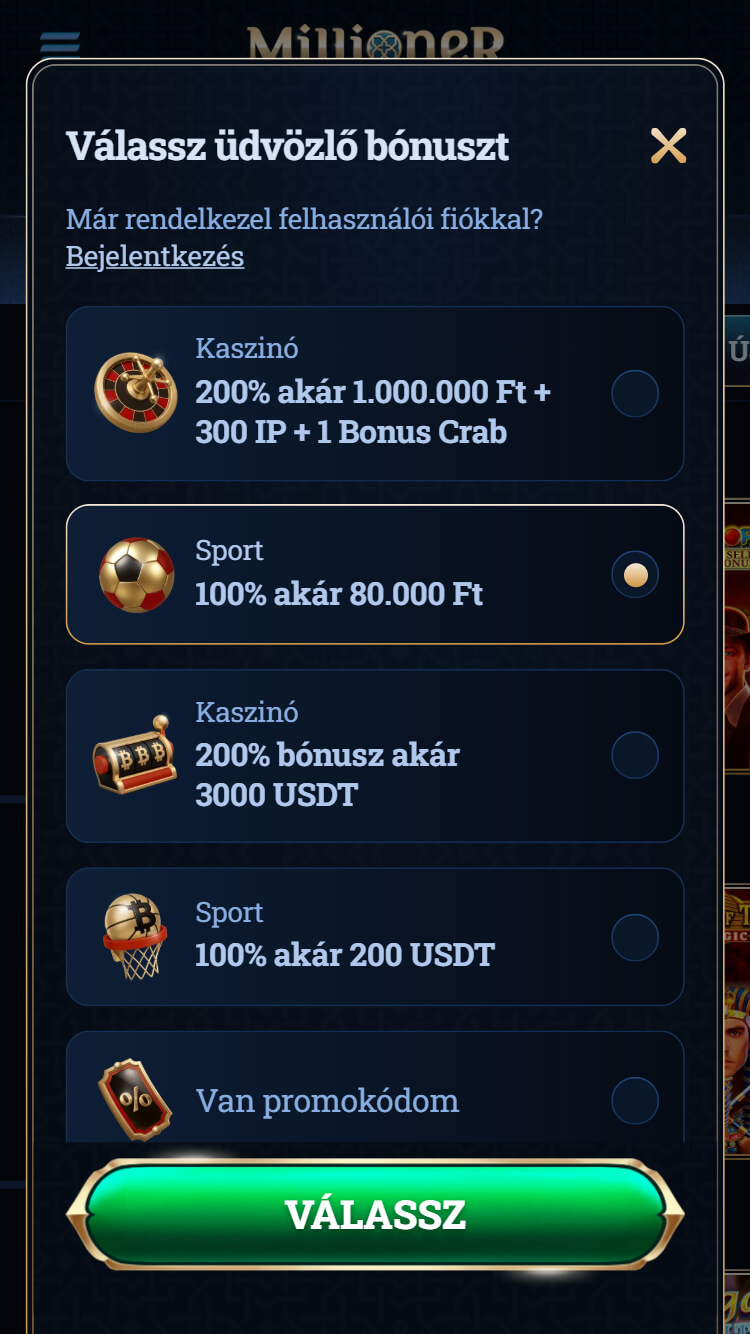 A Millioner az új játékosok számára kétféle üdvözlő bónuszt is felkínál. Az első befizetésed 100%-át, akár 80 000 Ft-ig kaphatod meg bónuszként. A minimális összeg, amit be kell fizetni a kezdéshez 6.000 Ft. Az üdvözlő bónusz megforgatási követelményei 1x-es a befizetett összegre vonatkozóan, legalább 1,5-ös szorzóval. A másik kezdő bónusz lehetőség a kriptovaluták kedvelőinek szól. A kripto üdvözlő bónusz 100%-os kezdő lökést jelent, akár 200 USDT-ig (177.200 Ft-ig). A megforgatási követelmény ebben az esetben is 1x-es a befizetett összegre vonatkozóan, legalább 1,5-ös szorzóval. A minimum befizetési összeg 20 USDT (kb. 7.200 Ft).
