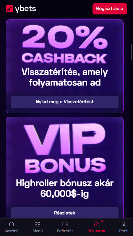 Külön mobilos bónusz nincs, ami kicsit csalódás lehet, egy egyszerű promóció is ösztönözhetné a mobilhasználatot. Mivel app nincs, letöltési folyamat sincs, viszont a Ybets mobiloldala hozzáadható a kezdőképernyőhöz, így kvázi alkalmazásként működik.
