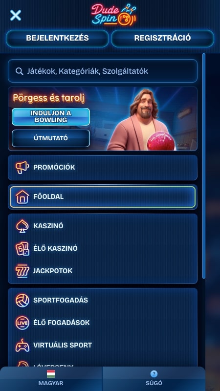 A betöltési sebesség gyors, a felület pedig reszponzív. Ami különösen fontos az olyan kategóriáknál, ahol nagyszámú játék jelenik meg egyszerre. A gombok jól elkülönülnek és a funkciók egyértelműek. A regisztrációs vagy befizetési folyamat minden lépésnél tiszta vizuális visszajelzést ad. Vagyis a DudeSpin kaszinó kiemelkedően kényelmes és gördülékeny felhasználói élményt nyújt.
