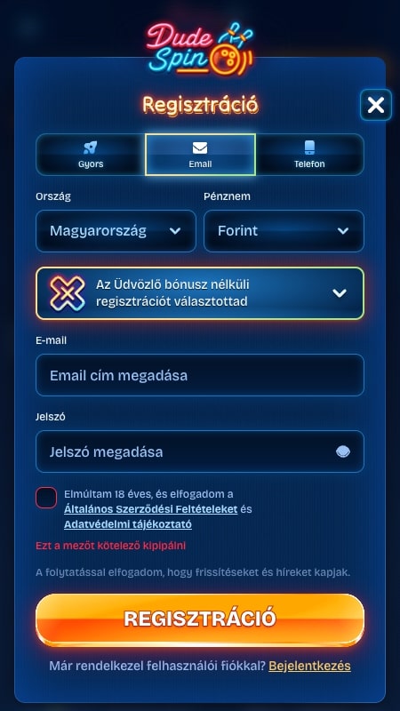 A regisztráció gyors a DudeSpin kaszinónál. Néhány percen belül elvégezhető, és mindössze néhány alapadatot igényel. A folyamat teljes egészében felhasználóbarát űrlapokon keresztül zajlik. Az alábbiakban bemutatjuk a belépéshez szükséges lépéseket: