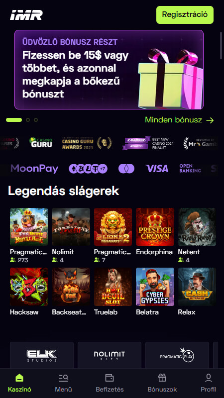 A játékok listájában a legismertebb fejlesztők szerepelnek, mint pl. a Pragmatic Play, NetEnt, Play’n GO, Spinomenal, Evolution Gaming, BGaming, Quickspin vagy a Nolimit City. A nagy szolgáltatói háttér biztosítja, hogy a felhasználók folyamatosan frissülő, modern, magas RTP-jű (Return to Player) játékokkal találkozzanak.