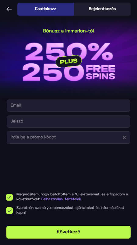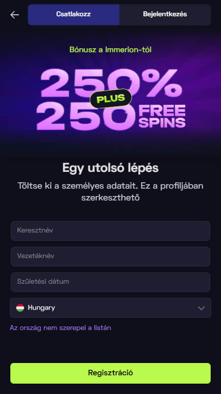 1. lépés: Hozz létre egy fiókot az Immerion kaszinóban a regisztrációs folyamat végigvitelével.