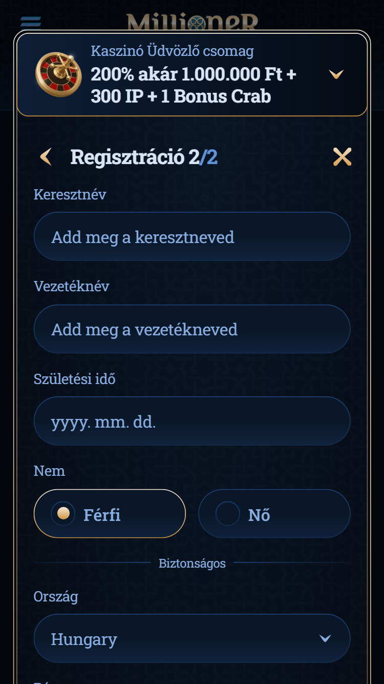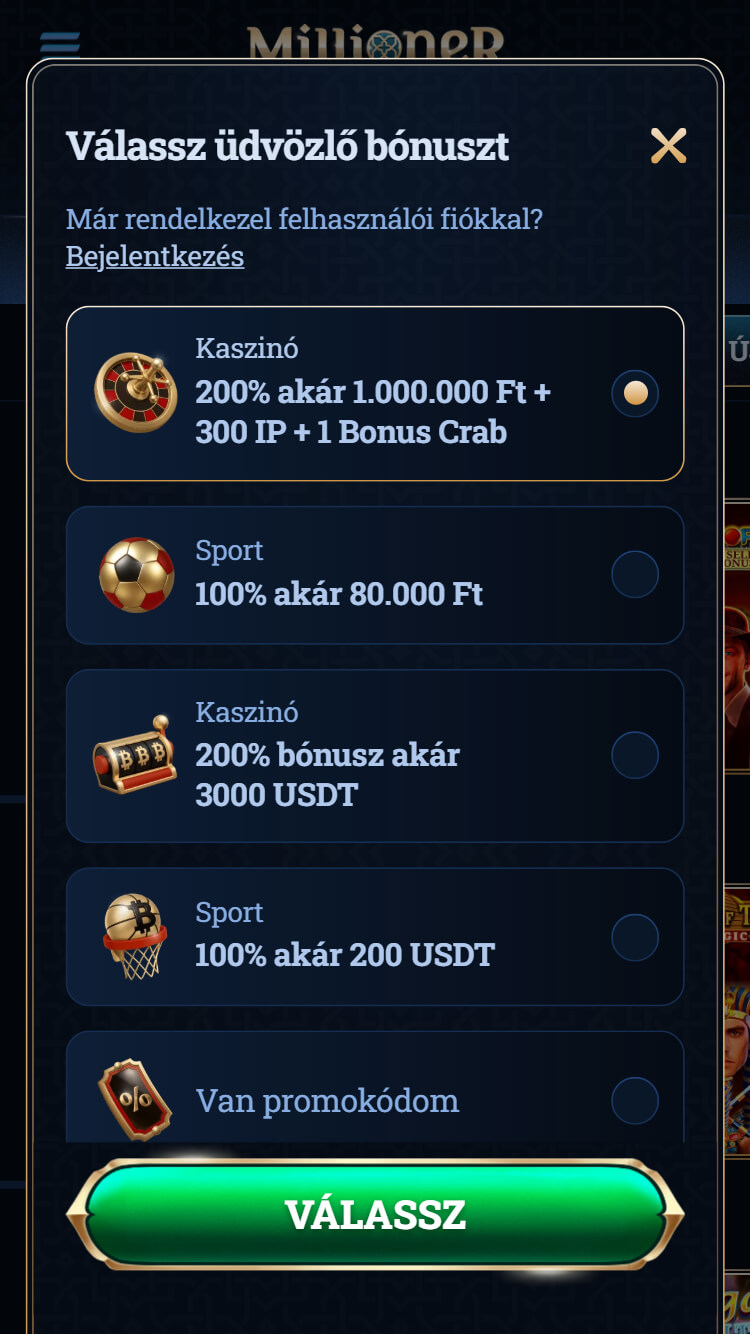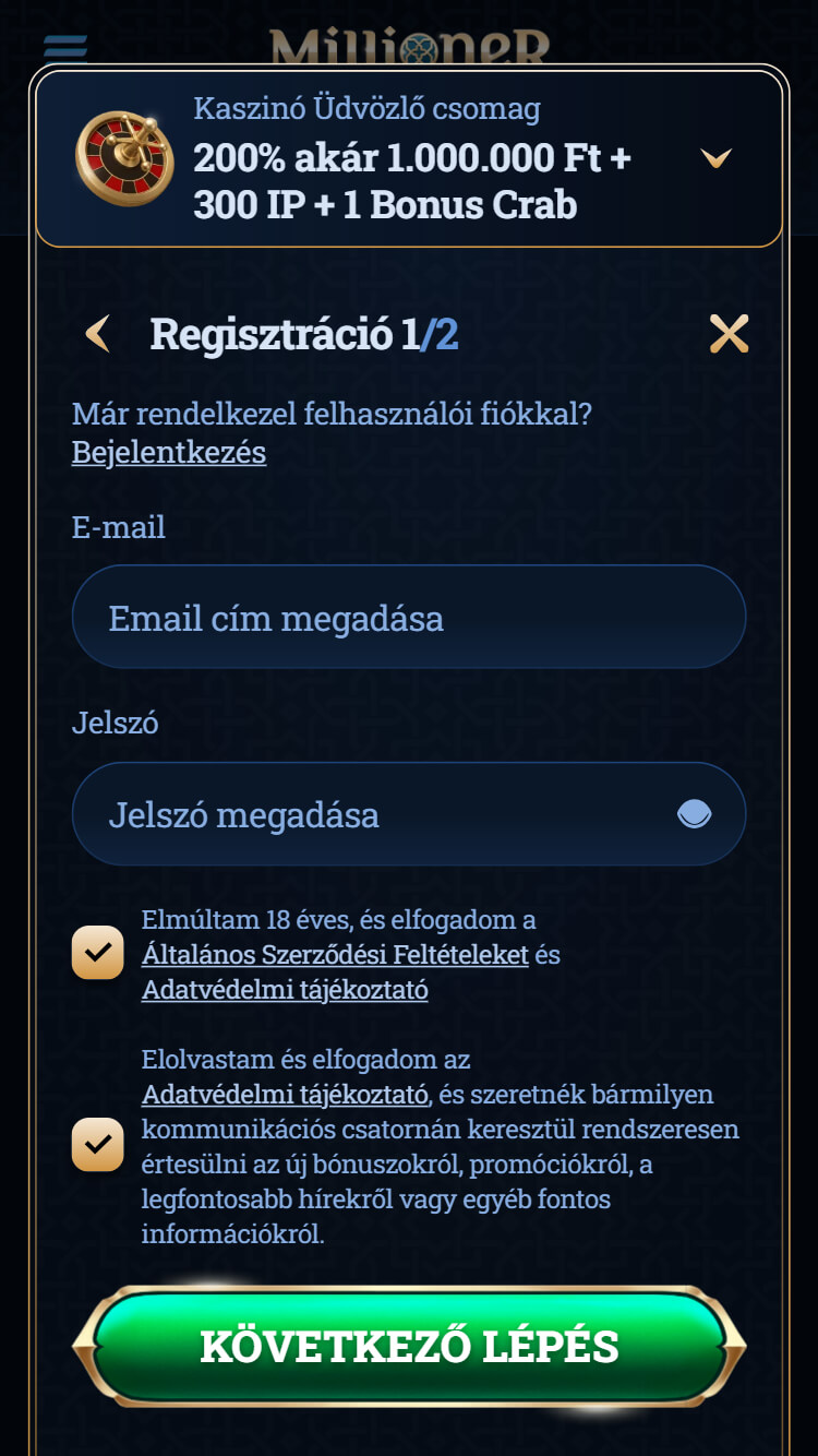 A Millioner kaszinó bónuszrendszere kimondottan nagylelkű, amely minden játékost – a friss regisztrálóktól kezdve a rendszeresen visszatérőkig – jutalmaz. Az üdvözlő csomagtól kezdve a heti reload bónuszokon át a VIP programig számos lehetőség kínálkozik a nyeremények növelésére. Kétféle üdvözlő bónusz közül választhatunk. Az első ajánlat 200% az első befizetésre, akár 1.000.000 Ft értékben + 300 IP + 1 Bonus Crab. A második pedig a kriptósoknak kedvez, ebben az esetben 200%-ot kapunk, akár 3.000 USDT értékben. Az alábbiakban bemutatjuk, hogyan tudod az üdvözlő bónuszt igényelni: